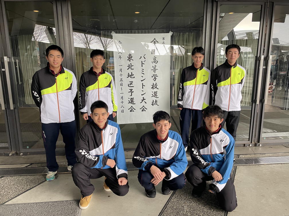 バドミントン部男子団体チームが県予選を勝ち抜き、全国高校選抜大会東北地区予選会に出場しました。仙台市で開催された東北大会では、残念ながら、初戦敗退となりましたが、今後更なる活躍が期待される戦いぶりでした。
